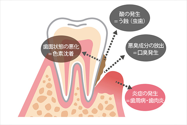 バイオフィルムには唾液中と比較すると、非常に高濃度で菌が存在しています。また、バイオフィルム中は酸素濃度が薄い嫌気的な環境であり、嫌気性細菌(生育に酸素を必要としない細菌)が多く含まれます。口腔における病原性細菌の多くは嫌気性細菌であり、バイオフィルムによってこうした病原性細菌に好ましい環境が形成されてしまいます。