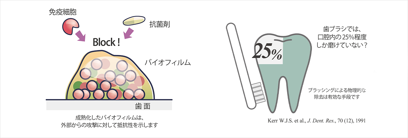 バイオフィルムは、内部に細菌及びその代謝物である多糖類を含む巨大なコロニーです。細菌感染症のおよそ80%がバイオフィルム性疾患とも言われています。口腔内においても、口腔細菌により形成されるバイオフィルム(別名:デンタルプラーク、歯垢)は、う蝕(虫歯)、歯周病、口臭、色素沈着など様々な疾患の原因であることが知られています。
