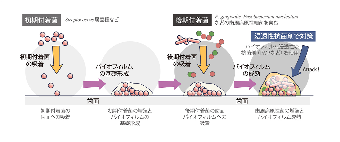 3の後期付着菌のグループには歯周病の原因菌が多く含まれており、これらの菌がバイオフィルムに組み込まれることは、重大な口腔疾患の原因となります。