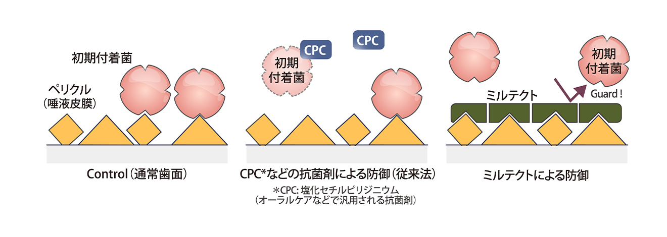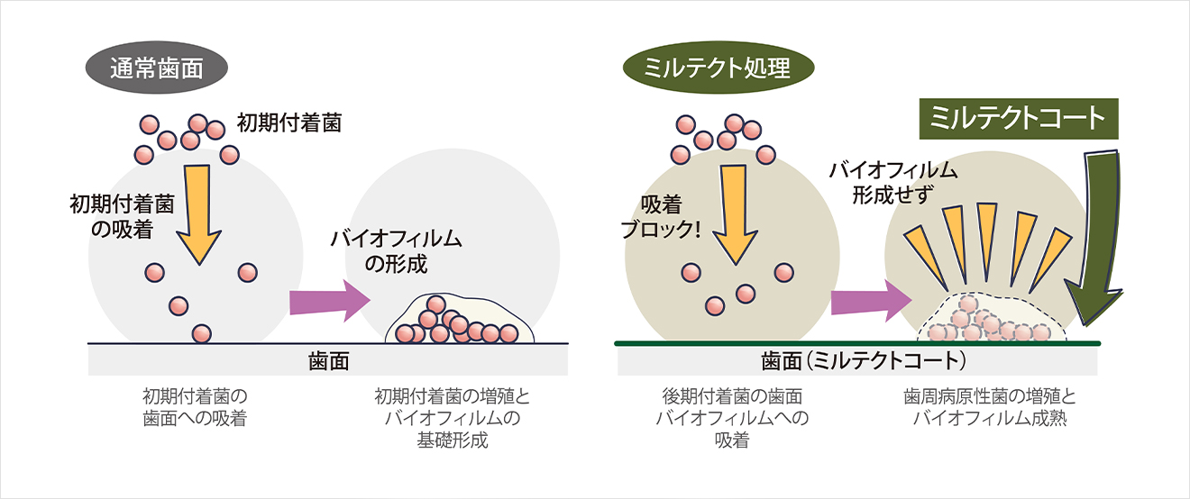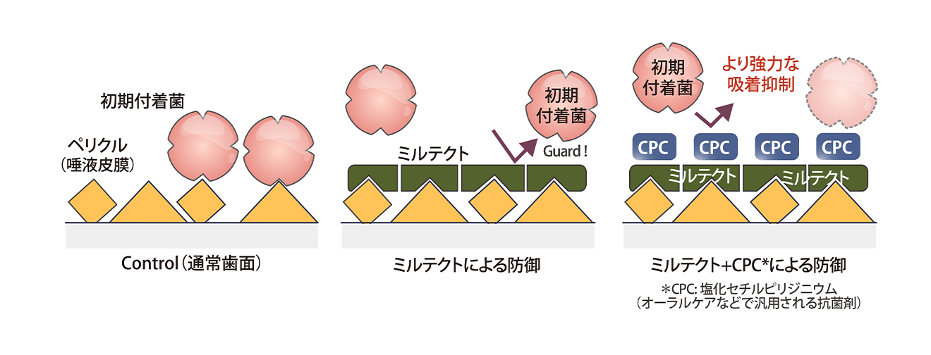 ミルテクトには下図のように、菌の初期付着を抑制する作用が確認されています。つまり、ミルテクとトは、口腔細菌の付着を抑制することでバイオフィルム形成を抑制します。
