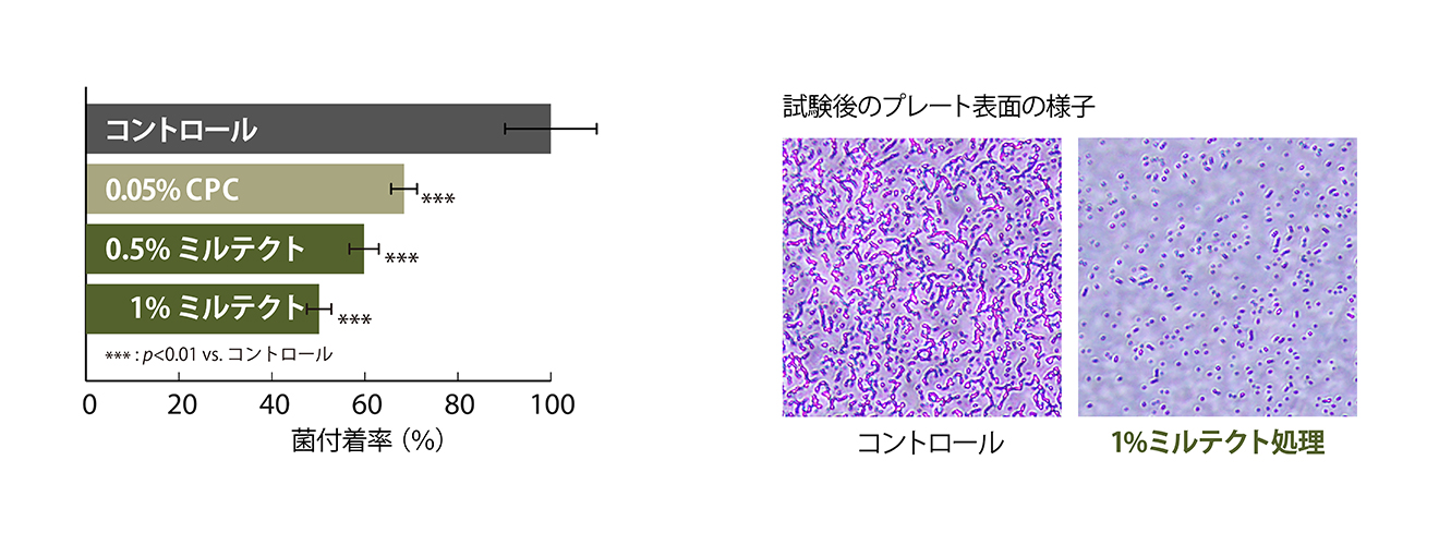 ミルテクトの抗バイオフィルム作用を確かめるために、マイクロプレートを使用した初期付着菌の付着抑制試験を行いました。その結果、CPCなどの抗菌剤を使用した方法と比較して、より高い菌付着抑制作用が確認されました。
