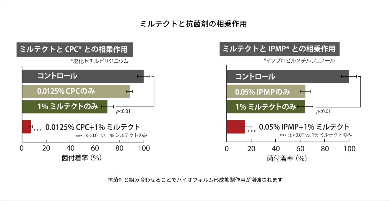 ミルテクトは、CPCなどの抗菌剤と混合して使用することで、そのバイオフィルム抑制作用を大幅に増強させることが可能です。