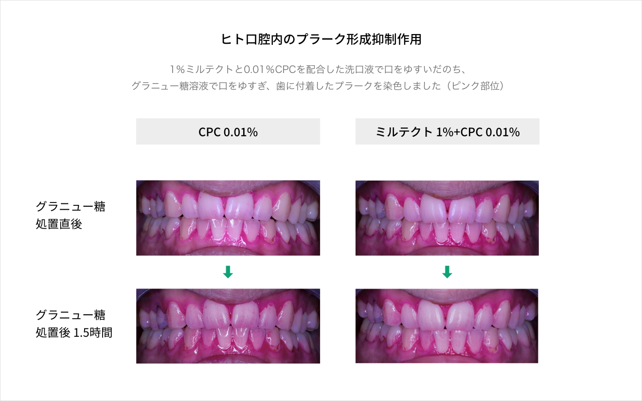 さまざまなお口の悩みは、口腔中に生息する細菌によって発生することが知られています。特に細菌が歯や粘膜の表面に形成するバイオフィルム(デンタルプラーク)は、毒性が高く、オーラルケアにおける最大の障害となっています。ミルテクトは、バイオフィルム形成を抑制することで、多くの口腔疾患の予防に働きます。