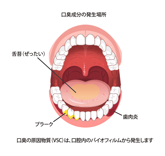 口臭は、口腔バイオフィルムに存在する細菌が食品中のアミノ酸を代謝することにより発生するVSC(揮発性硫黄化合物)が原因となります。