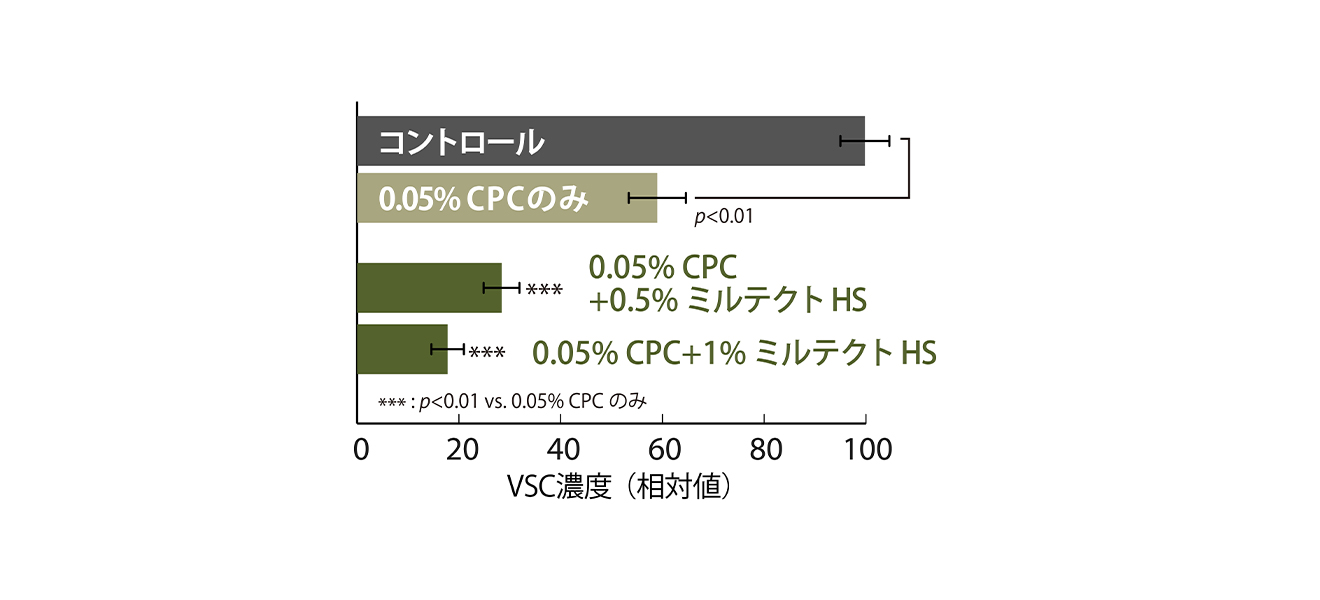 ミルテクトは、口腔細菌の歯面への吸着を抑制することで、結果的に細菌の代謝により発生する悪臭成分VSCを抑制します。ミルテクトをあらかじめコートしたプレートでは、口腔細菌によるシステイン由来VSCの発生が抑制されました。