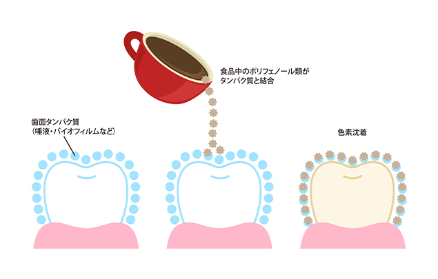 歯の着色は、歯面に存在する菌あるいは唾液由来のタンパク質と食品中のポリフェノール類、たばこのヤニのような脂溶性物質が複合体を形成し、不溶性の強固なステインを形成することが原因となります。