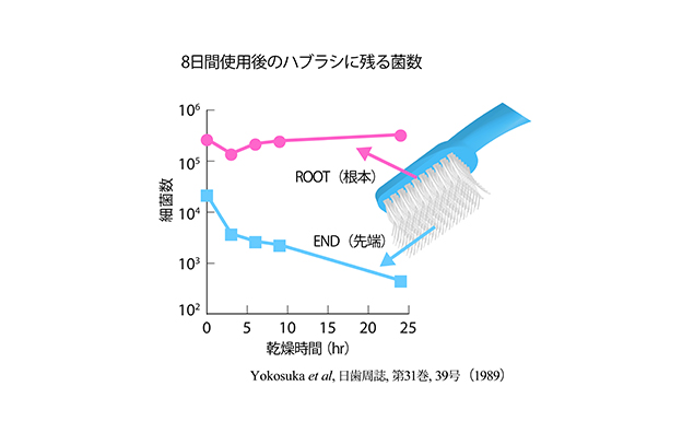 ハブラシに付着した菌は、乾燥によってある程度減少しますが、乾燥しにくいブラシ根元の部分には、バイオフィルムが形成されてしまうことが報告されています。