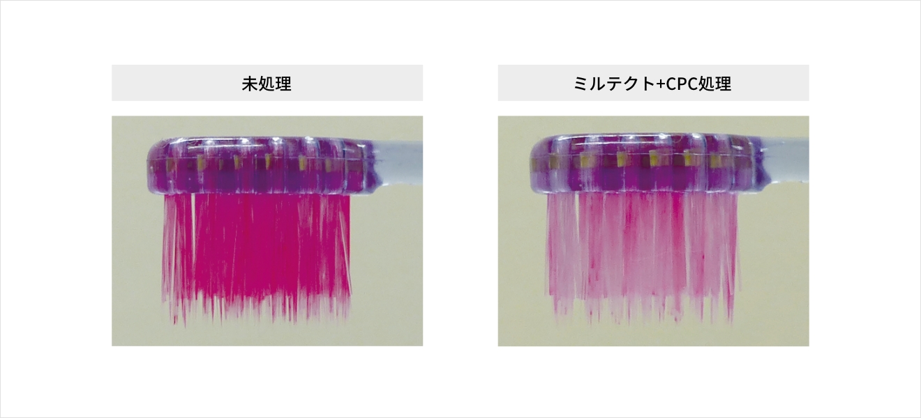 市販の歯ブラシにミルテクト・CPCで処理し、口腔細菌液に浸すことでバイオフィルムを形成させました。歯ブラシに吸着した細菌を染色したところ、あらかじめミルテクト処理した歯ブラシではバイオフィルムの形成が抑制されました。